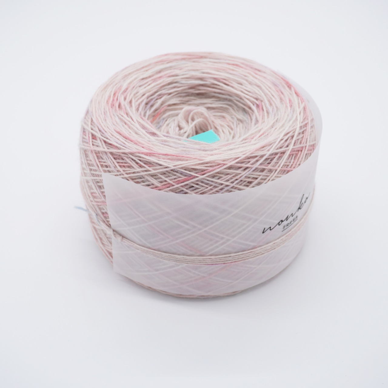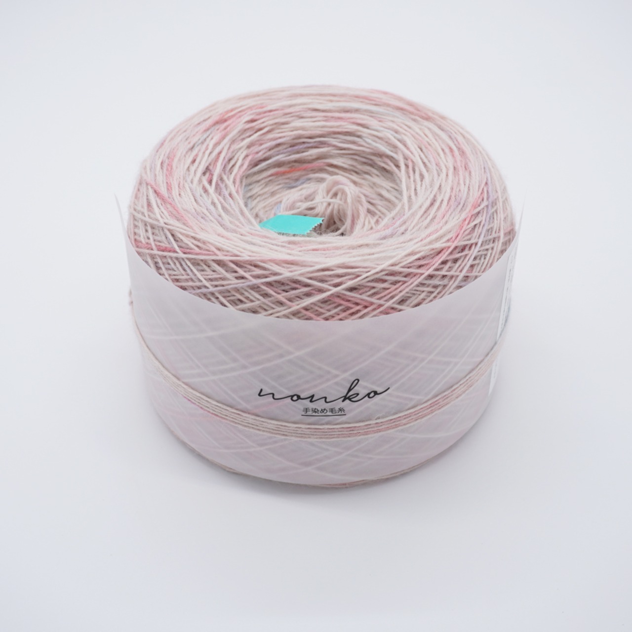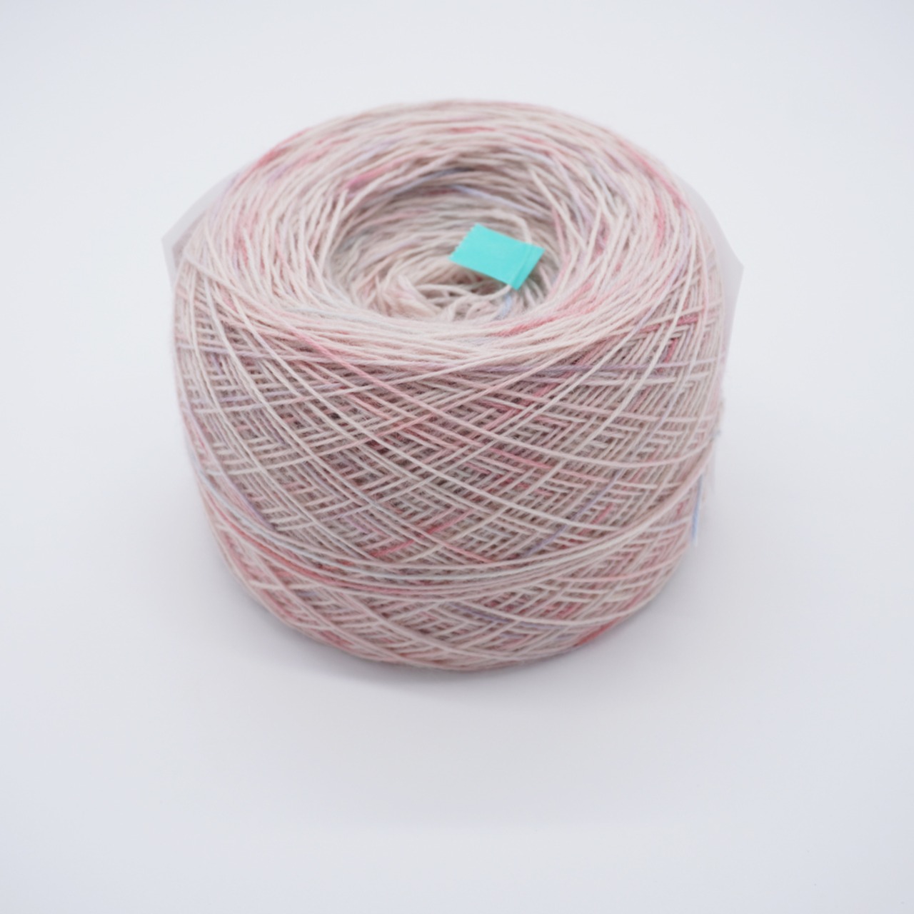 くすみアイボリーにピンク、パープルを散りばめたのミックス染め毛糸です。