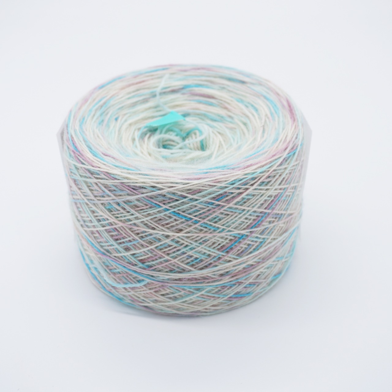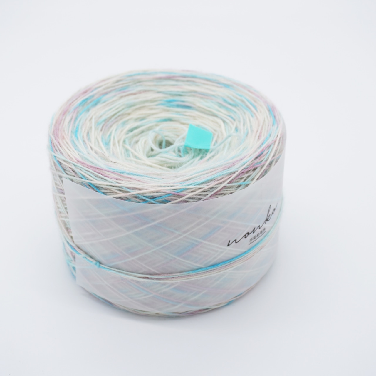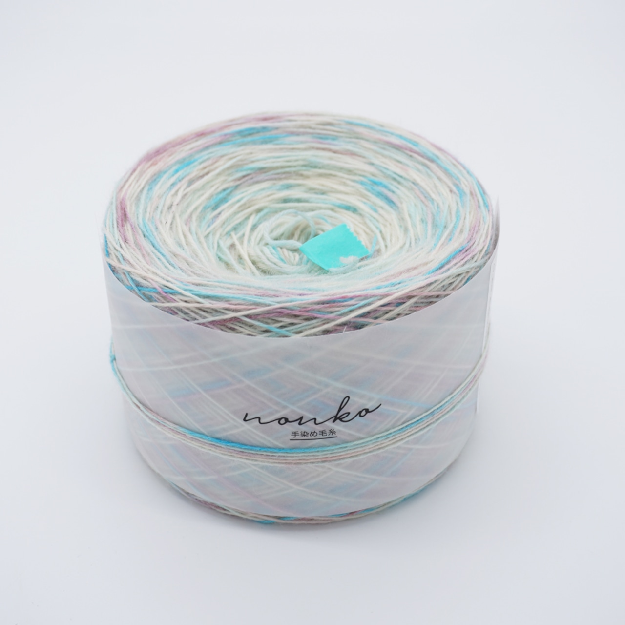 ピンク・アイボリー・スカイブルーのミックス染め毛糸です。